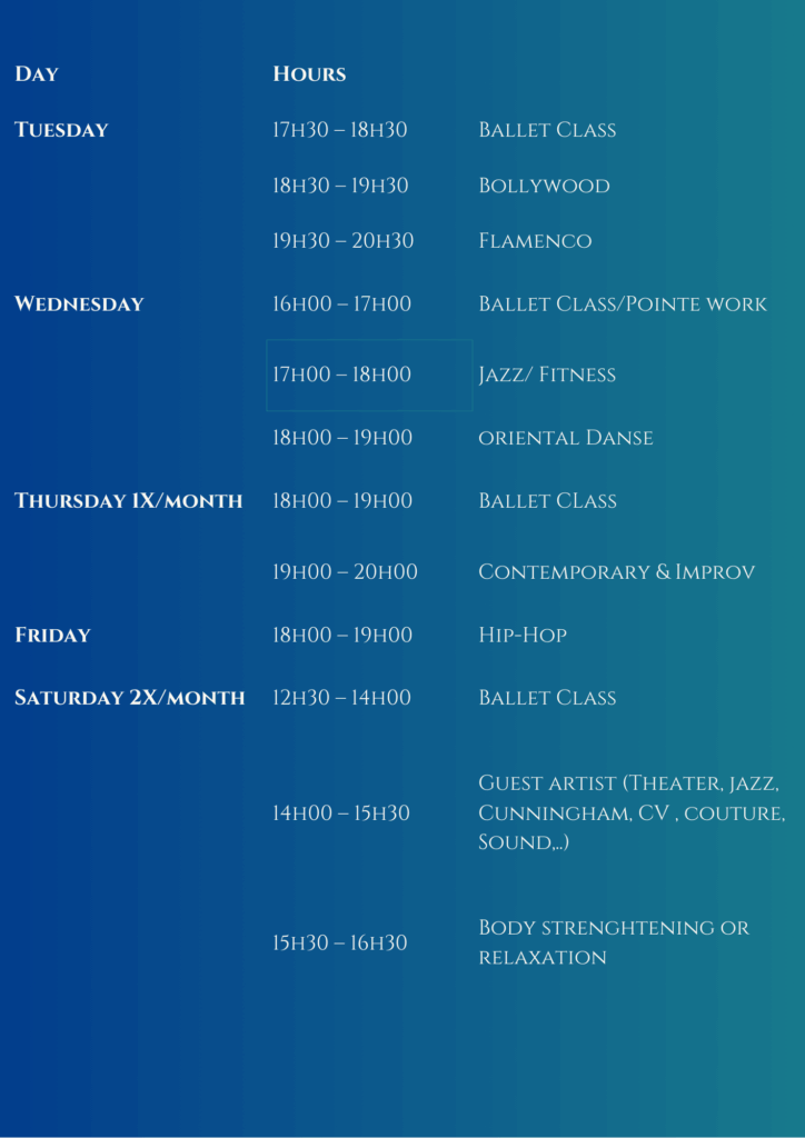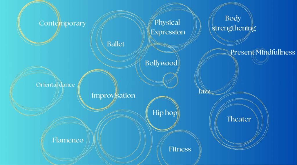 - World dances: Indian dance (expressivity), Hip-Hop (dynamism), Contemporary (grounding and fluidity), Oriental (presence and confidence), Flamenco (energy and power), Improvisation (creativity),
